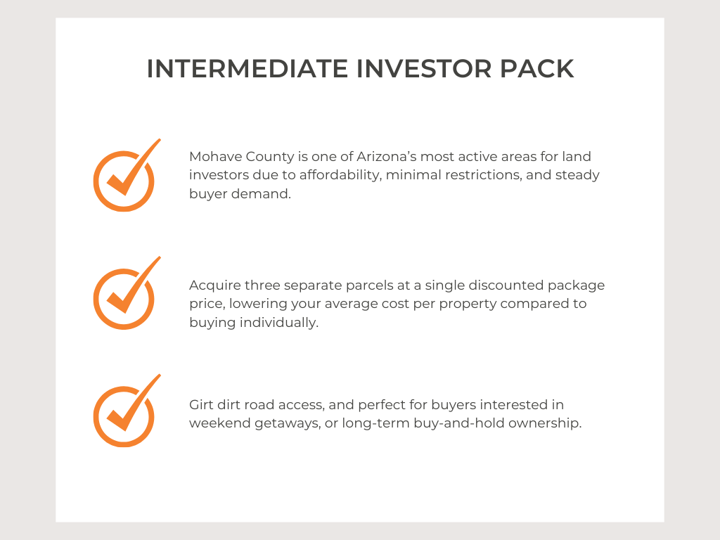 This exclusive investor package includes three separate vacant land parcels in Mohave County, offered together at a bundled price for maximum value and flexibility. Whether your strategy is resale, seller financing, or long-term hold, this package provides multiple exit options in one of Arizona’s most investor-friendly markets. Mohave County is a proven favorite among land buyers thanks to its affordable pricing, minimal restrictions, and strong demand for recreational and off-grid properties. Owning three parcels at once allows you to diversify your approach — resell individually, finance one or more for monthly income, or hold as Arizona land values continue to trend upward. With low carrying costs, no tenants, and no maintenance, this investor pack is ideal for both seasoned land investors and those looking to scale their portfolio efficiently with a single acquisition.