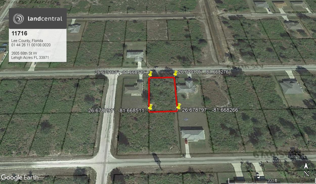 This 0.25-acre lot is located at 2605 68th St. W in Lehigh Acres in Florida. This property is a flat lot with heavy tree cover, between two houses. This undeveloped lot is located on a paved street with electricity along the road. About thirty minutes from Fort Myers, there are plenty of amenities close by, to make this your new home!