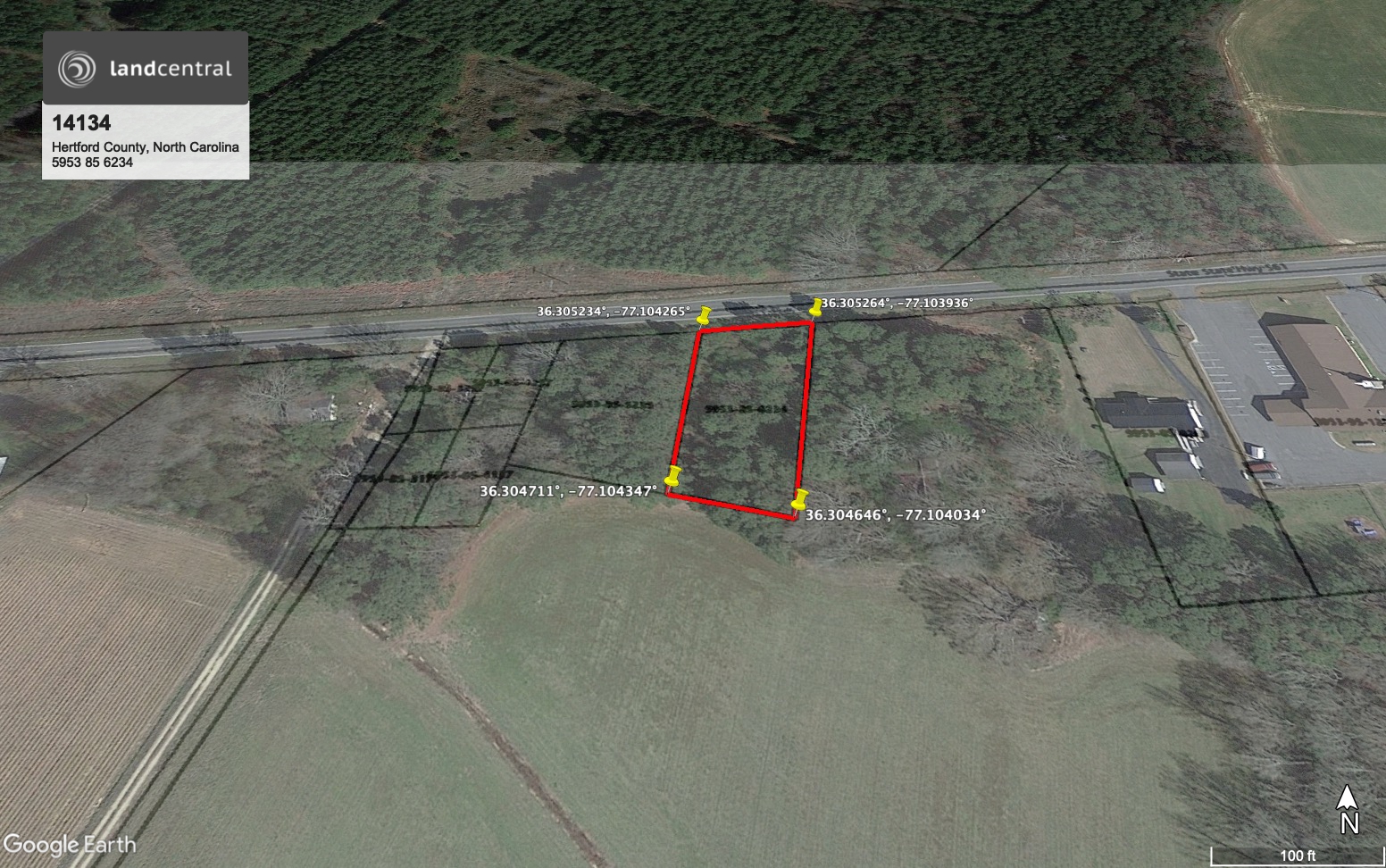 All that certain piece, parcel or lot of land located in St. Johns Township, Hertford County, North Carolina, on the South side of North Carolina Highway 561 and BEGINNING at a stake, near a driveway, a corner for this property , that of said highway and other lands of the said Edna Earl Edwards and Joseph A Early; and running thence along said Edwards and Early line in a Northerly direction 240 feet to a stake; thence continuing along said Edwards and Early line in a Easterly direction 95 feet to a stake, a corner for the lands of Clarence C Holloman; thence along said Holloman line in a Southerly direction 200 feet to a stake on the aforesaid North Carolina Highway 561; thence along said highway in a westerly direction 95 feet to a stake, the point and place of beginning. This is the same parcel conveyed to Al Revelle Wiggins by Auphilus Wiggins and wife, Mary Wiggins in the deed dated June 18,1992 and recorded in Book 483, page 172 of the Hertford Public County Registry. The Hetford County Tax Department identification number for the subject tract is 5993-85-6234; and is further described as the lands conveyed by deed dated Oct 13,2003 from Stephanie B Irvin, Commissioner, to Hertford County, recorded at Book 624, page 60, Hertford County Registry. |